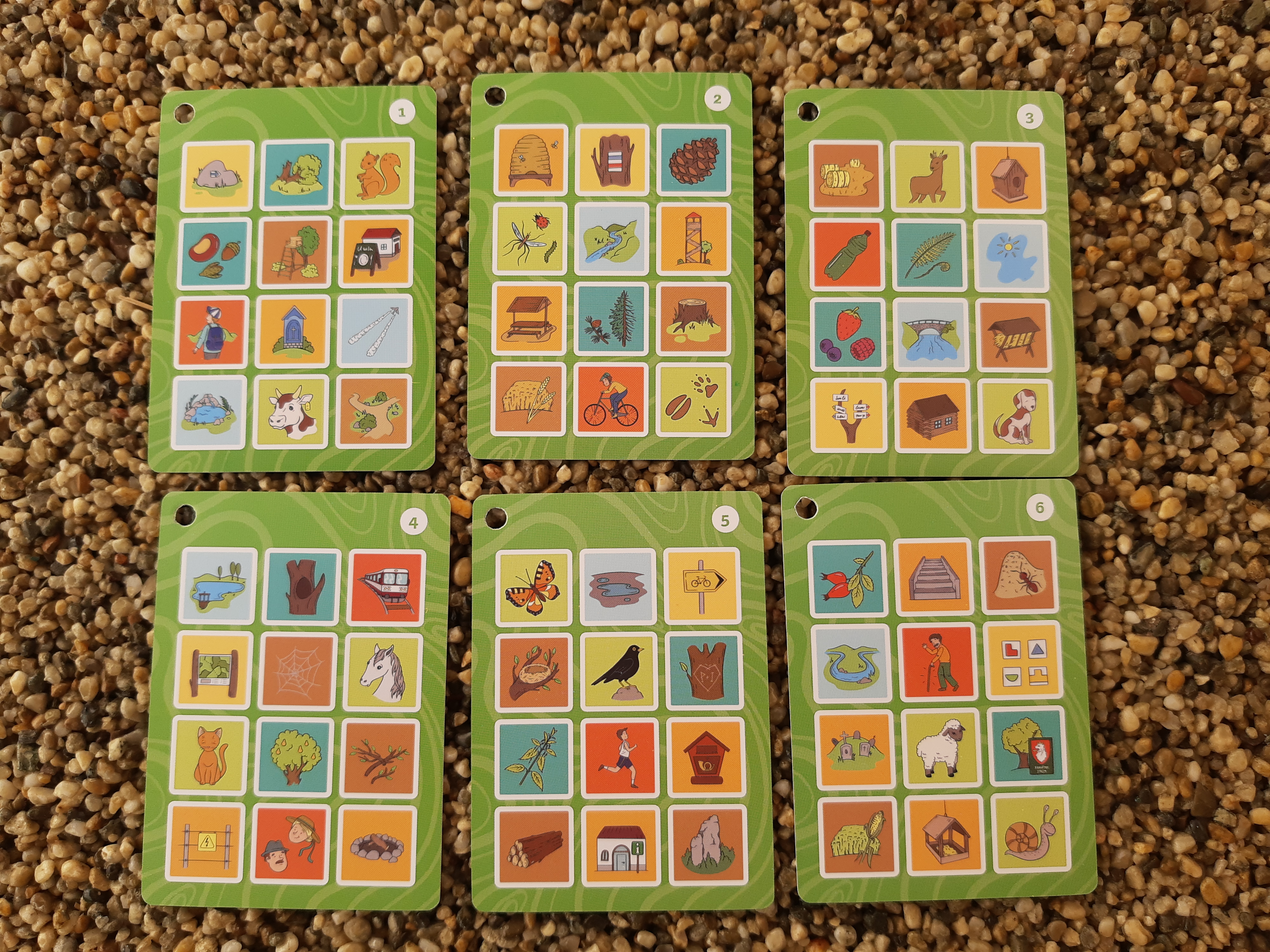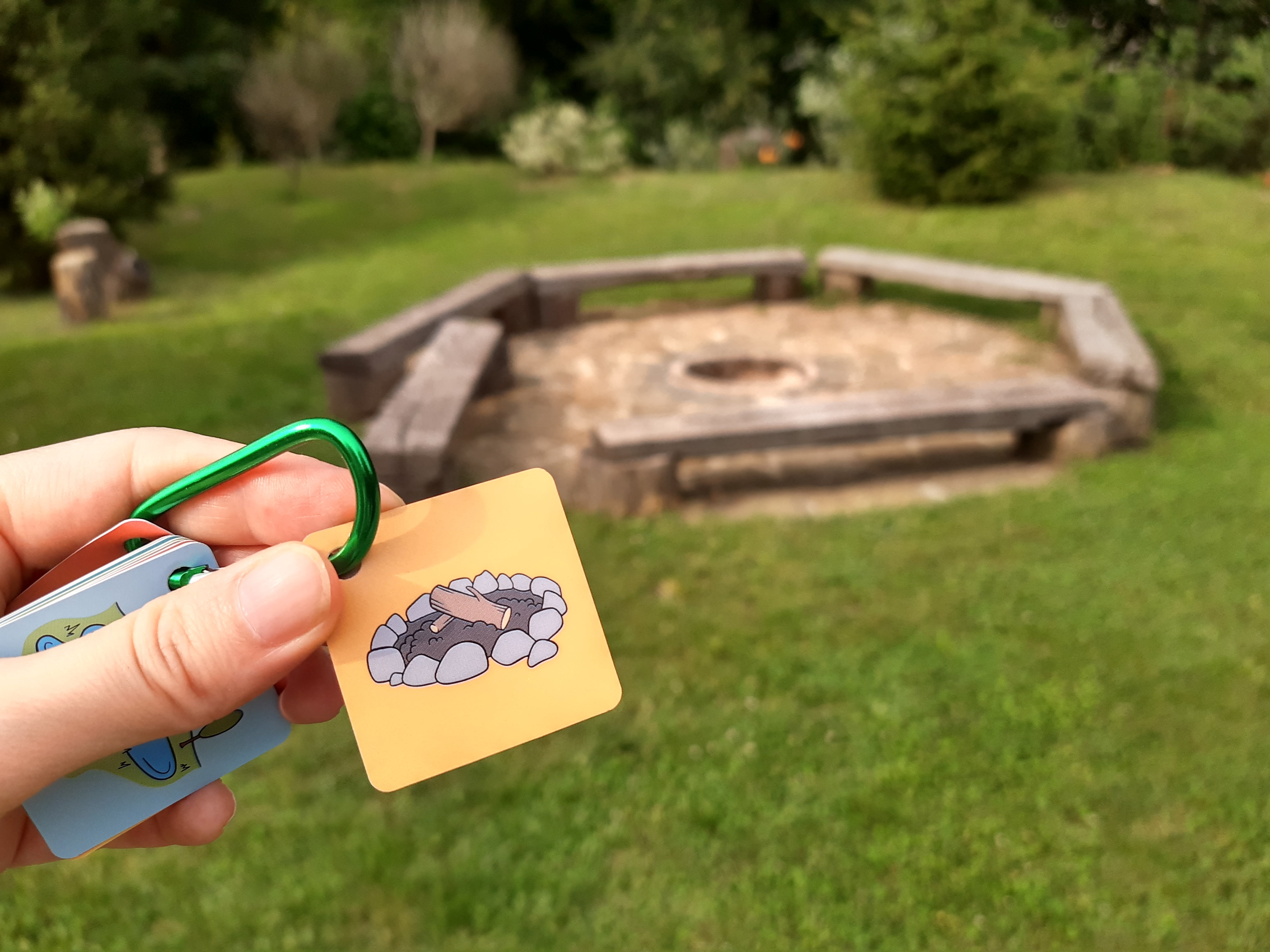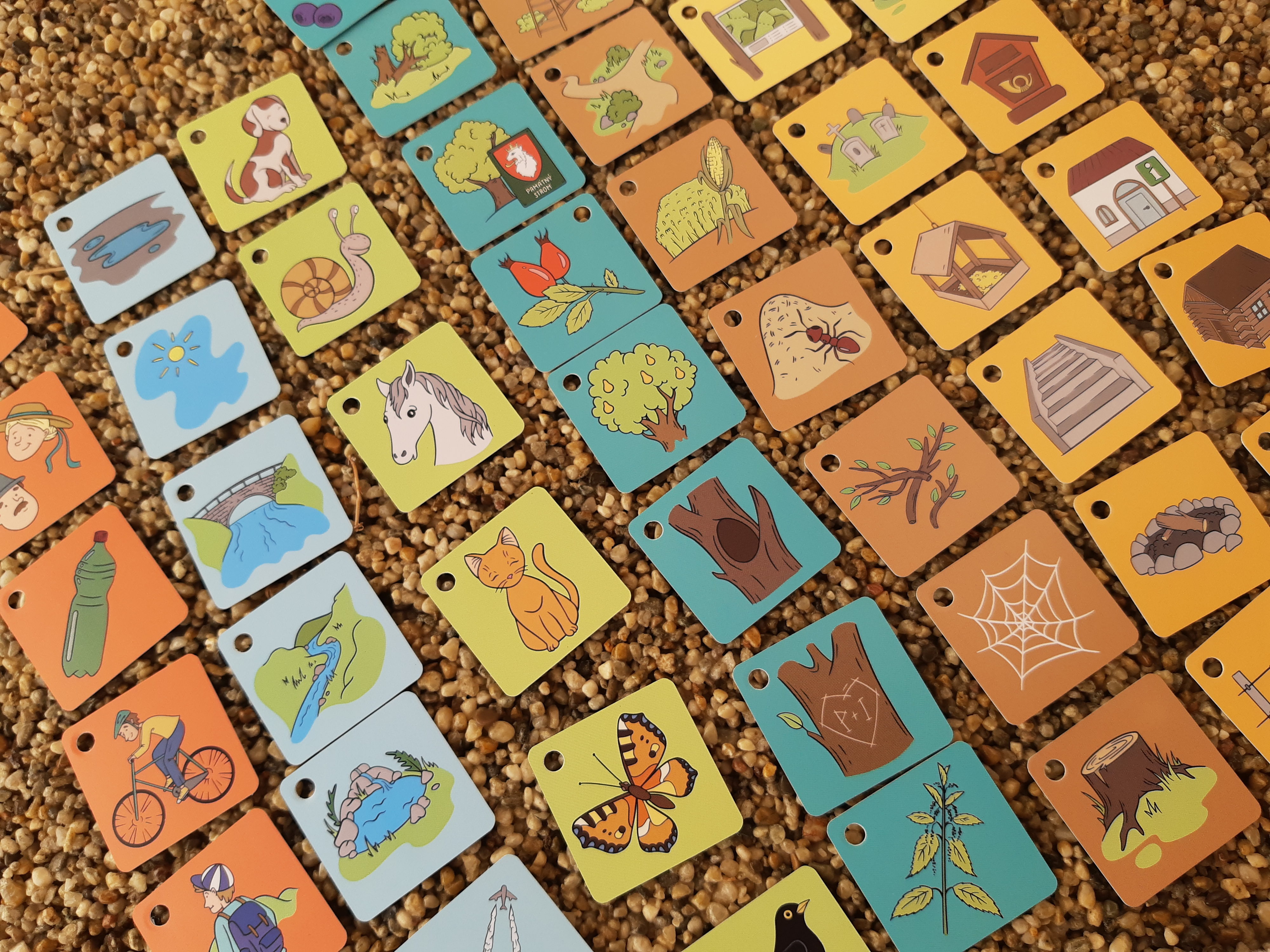 Hrací karta i obrázkové kartičky jsou plastové, neublíží jim tak ani déšť ani bláto. Cílem hry je nasbírat všech 12 obrázkových kartiček na svoji karabinu podle velké hrací karty. Ještě doma si tak Lukášek vylosoval/vybral 1 velkou hrací kartu. Obrázky jsme si spolu prošli, aby věděl, co má přesně hledat. Já jsem si připravila 12 obrázkových kartiček, abych je pak nemusela hledat ve stožku ostatních 70 kartiček a vyrazili jsme na náš minivýlet na Vápenky (více o výletu zde).