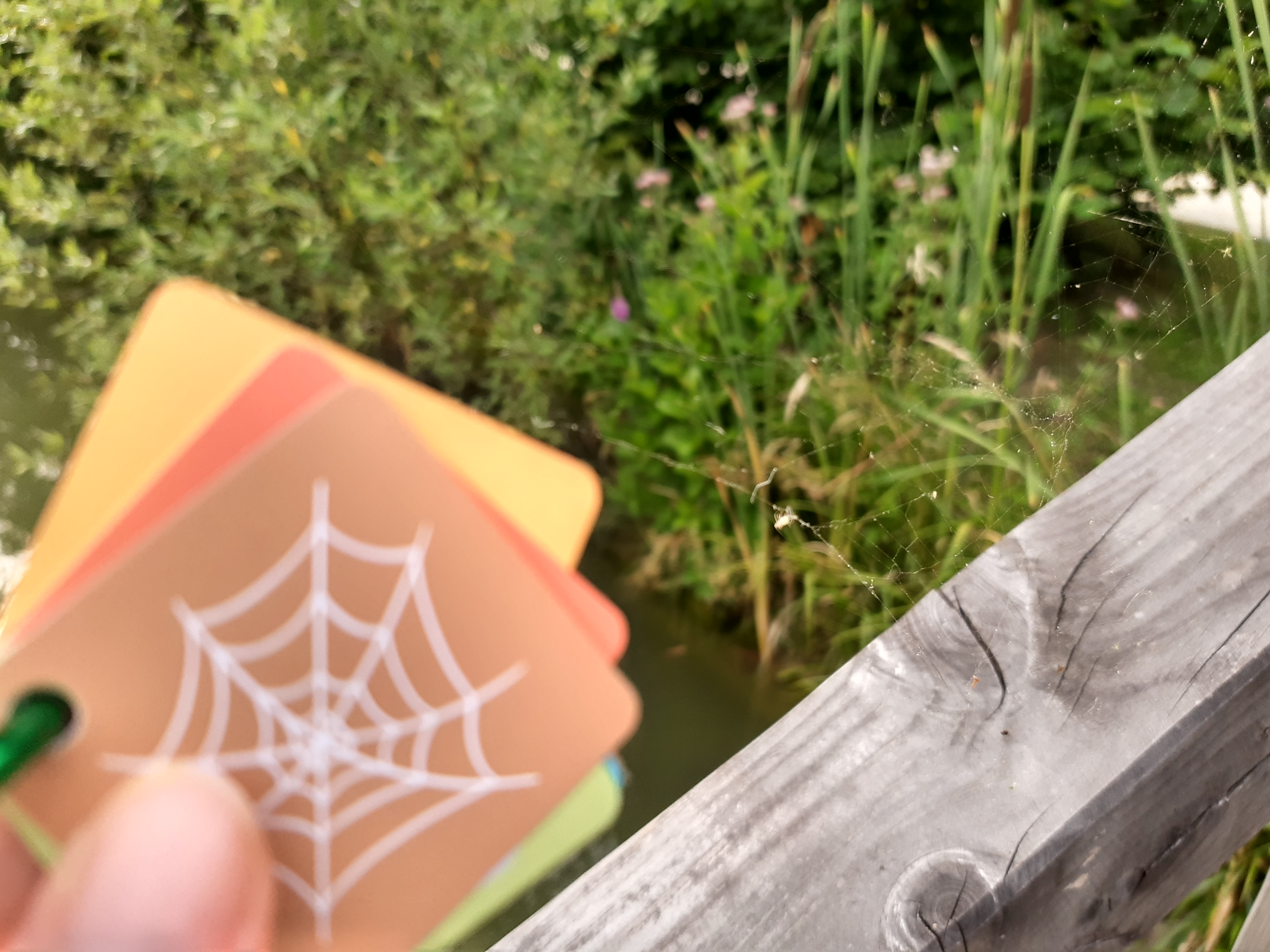 Upřímně jsem byla zvědavá, jestli Lukáška bude hra bavit a jestli si při výletění vůbec vzpomene, že má něco hledat (pro představu, co se hledá – karta 4: rybník (vodní nádrž), dutina ve stromě, vlak, turistická mapa, pavučina, kůň, kočka, ovocný strom, klestí, elektrický ohradník, pán nebo paní s kloboukem a ohniště). A za chvilku už bylo „MAMÍÍÍ, dívej pavučina – pavučina“ a pyšně ukazoval na obrázek a pavučinu, kterou právě můj malý Spiderman objevil. A pak teda následovala sada otázek a proč a jak a jak dlouho to tomu pavoukovi trvá … … … Tři tečky jsou málo.