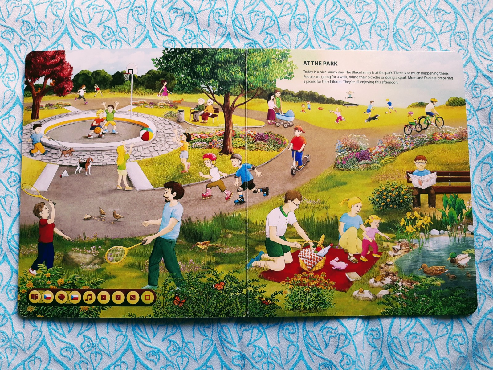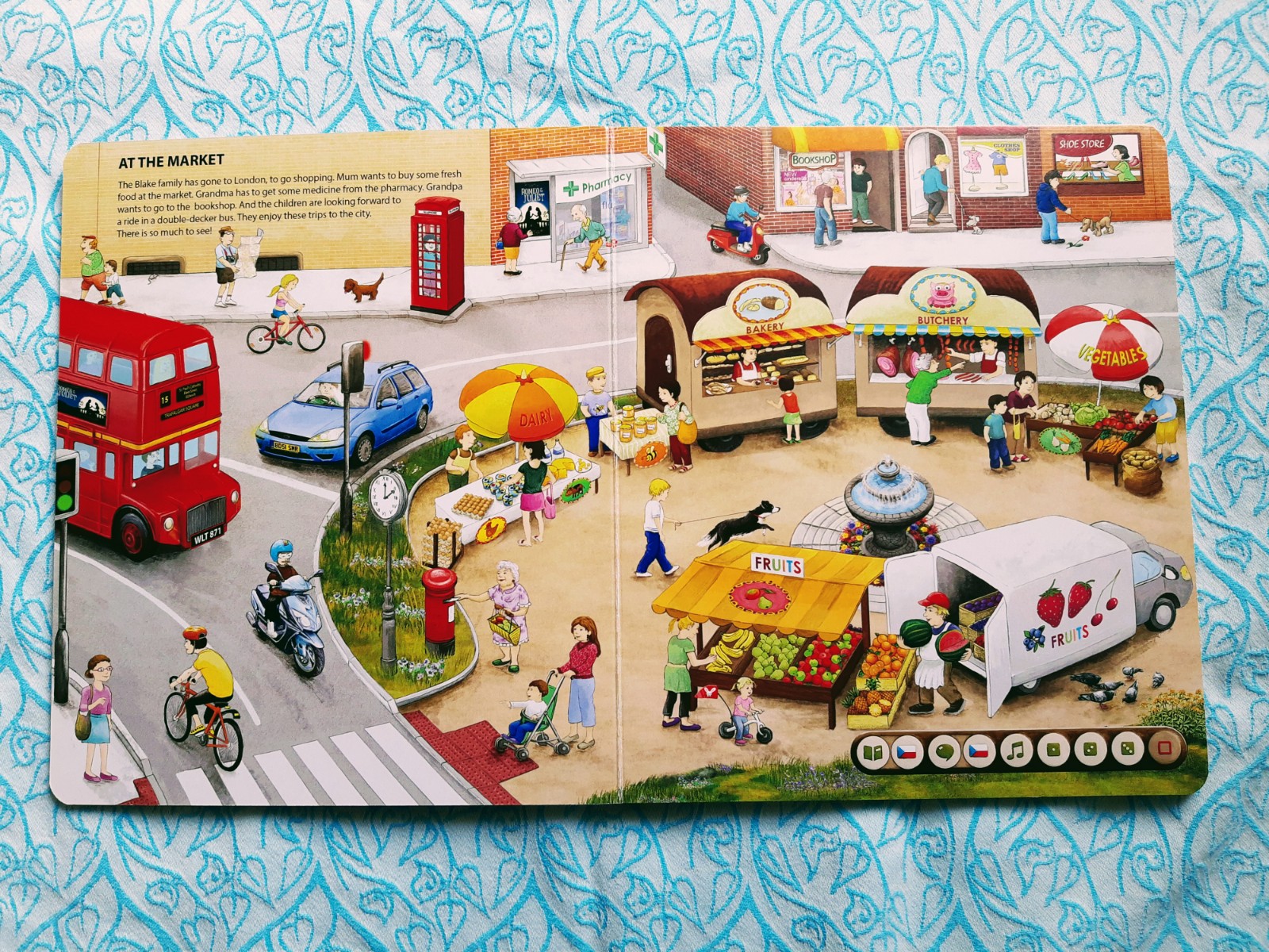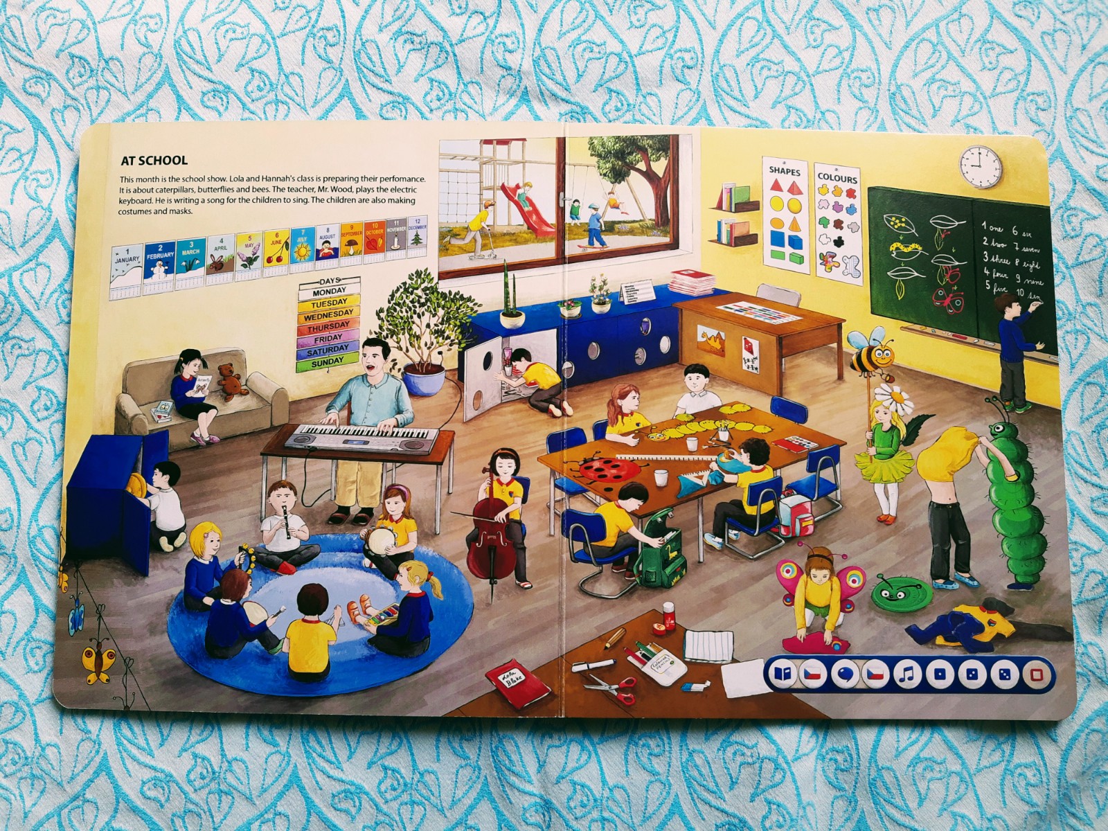 V knize najdete 6 tematických okruhů, z nichž každý má svůj prostor na jedné dvoustraně. Poslední dvě dvoustrany se pak věnují ročním obdobím. U každého tematického okruhu je krátký úvodník (krátký text), který tužka po přiložení přečte. Ilustrace jsou opravdu detailní. Hezky je například zpracováno téma „Ve škole“ – kde se děti mohou naučit i názvy měsíců, dny v týdnu, barvy, tvary, čísla atp.