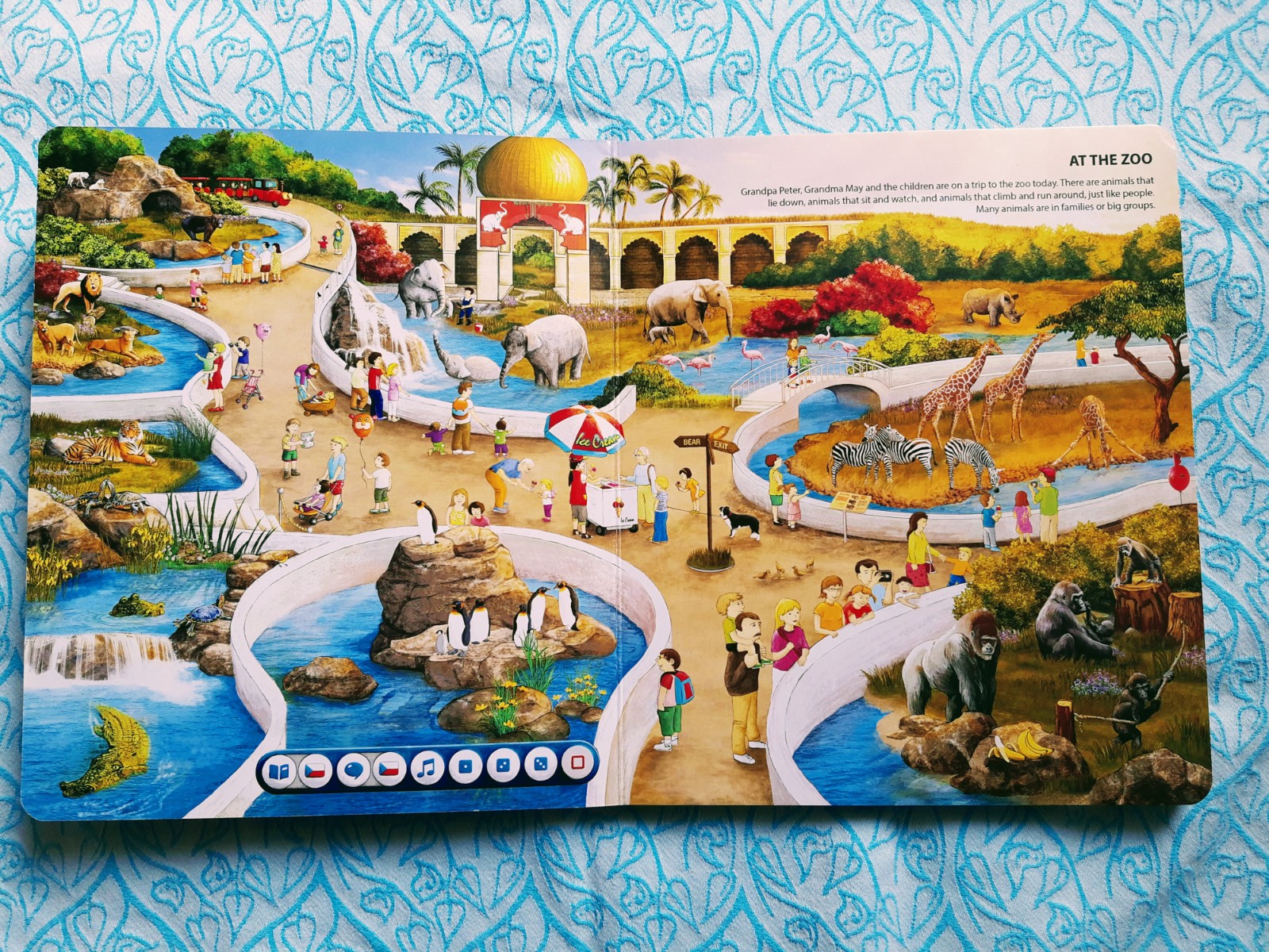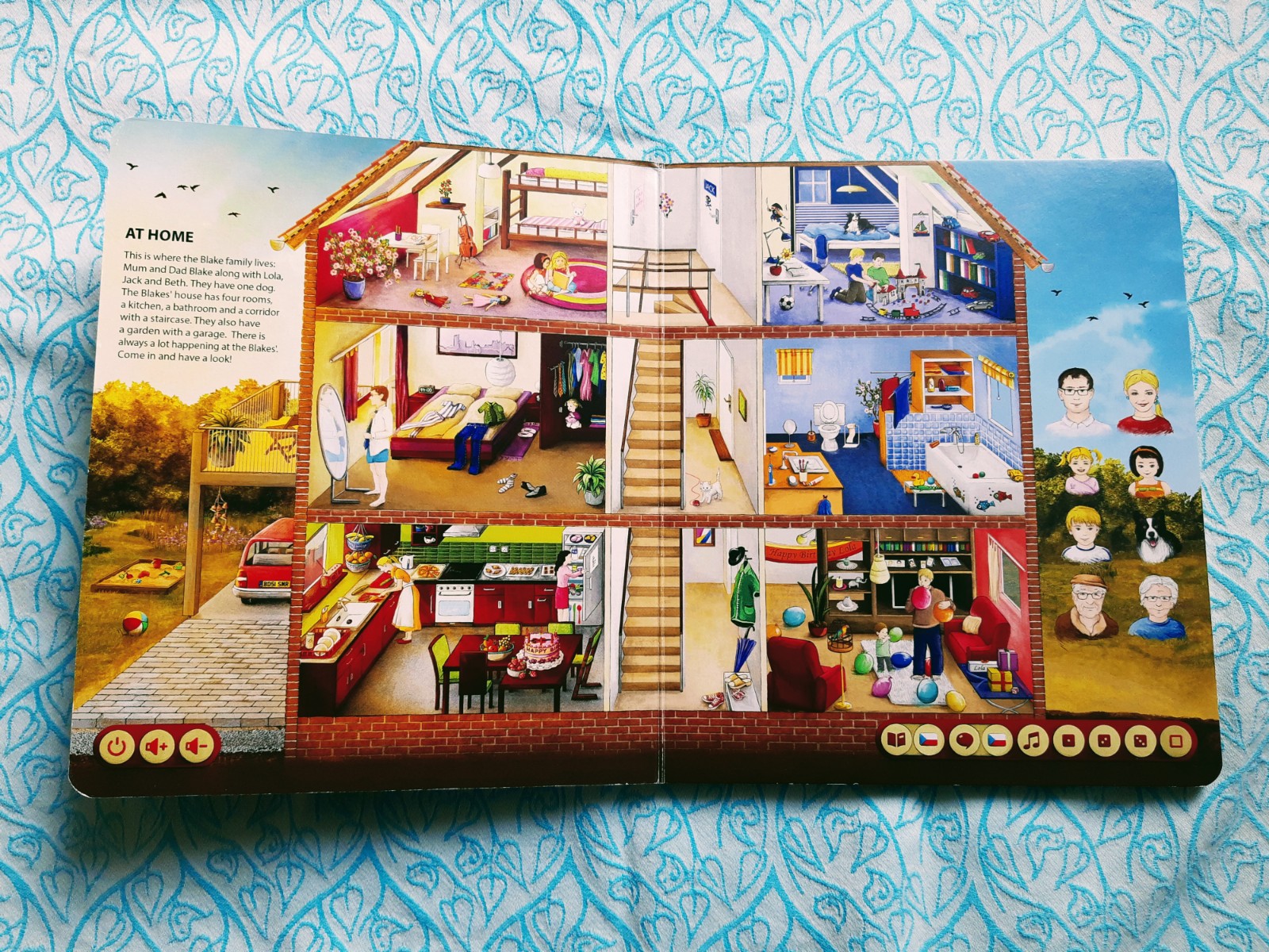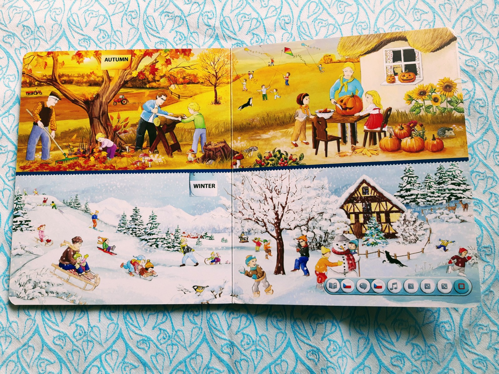 V knize najdete 6 tematických okruhů, z nichž každý má svůj prostor na jedné dvoustraně. Poslední dvě dvoustrany se pak věnují ročním obdobím. U každého tematického okruhu je krátký úvodník (krátký text), který tužka po přiložení přečte. Ilustrace jsou opravdu detailní. Hezky je například zpracováno téma „Ve škole“ – kde se děti mohou naučit i názvy měsíců, dny v týdnu, barvy, tvary, čísla atp.
