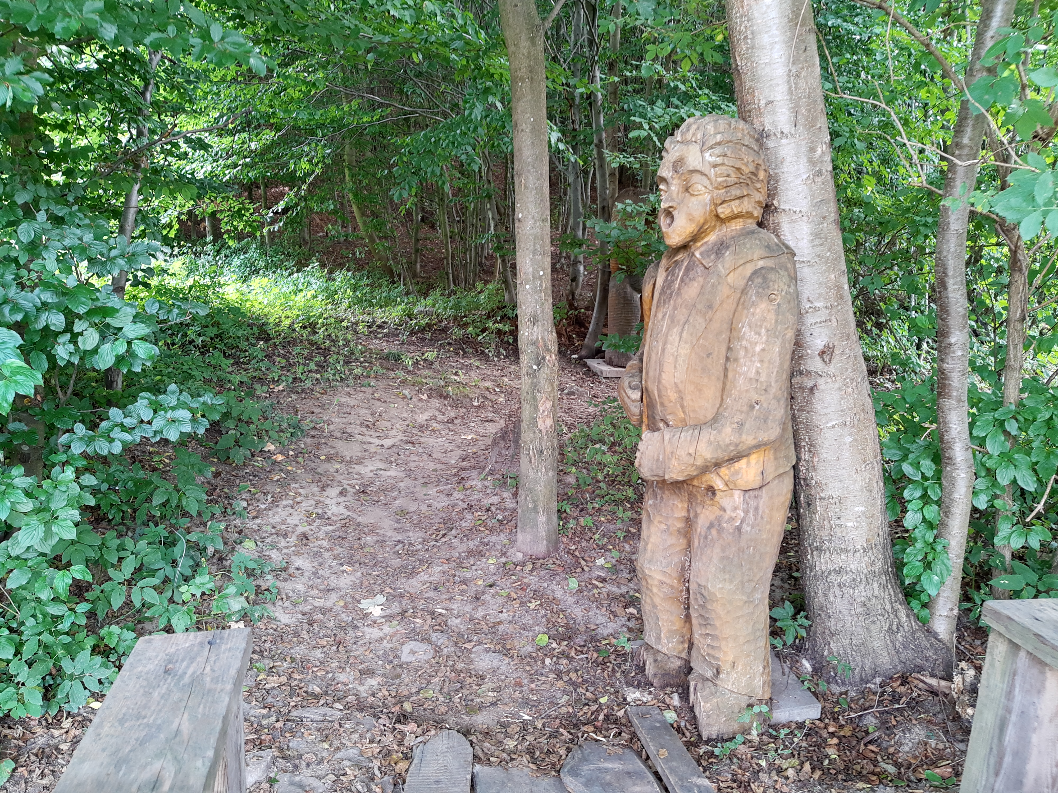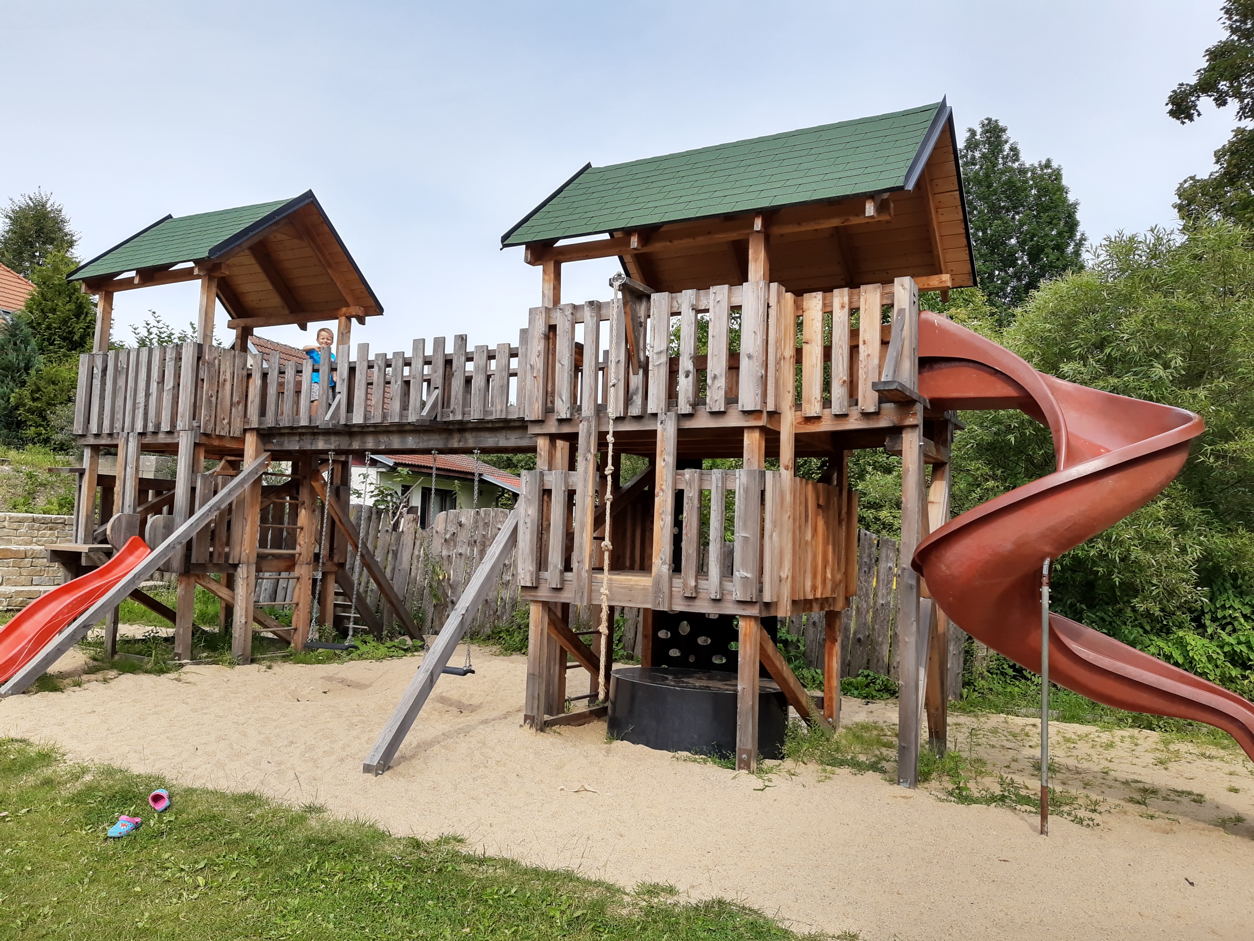 Nachází se zde velký – dřevěný – průlezkový domek s klasickou a točitou skluzavkou, dvě houpačky a z domku vede také lanovka. O kousek dále je pak „brána“ do lesa, kde jsou na začátku dřevěné sochy a také bunkr z klestí. Bohužel dále jsme se nemohli vydat, protože je zrovna sezóna komárů a fakt se to nedalo. Takže les necháme opředen rouškou tajemství a až se sem vydáte na výlet, můžete jej s dětmi prozkoumat. Nově zde mají nainstalované dva houpací vaky. Vedle je pak ohniště. Nahoře u vstupu se nachází menší koupací biotop s molem.