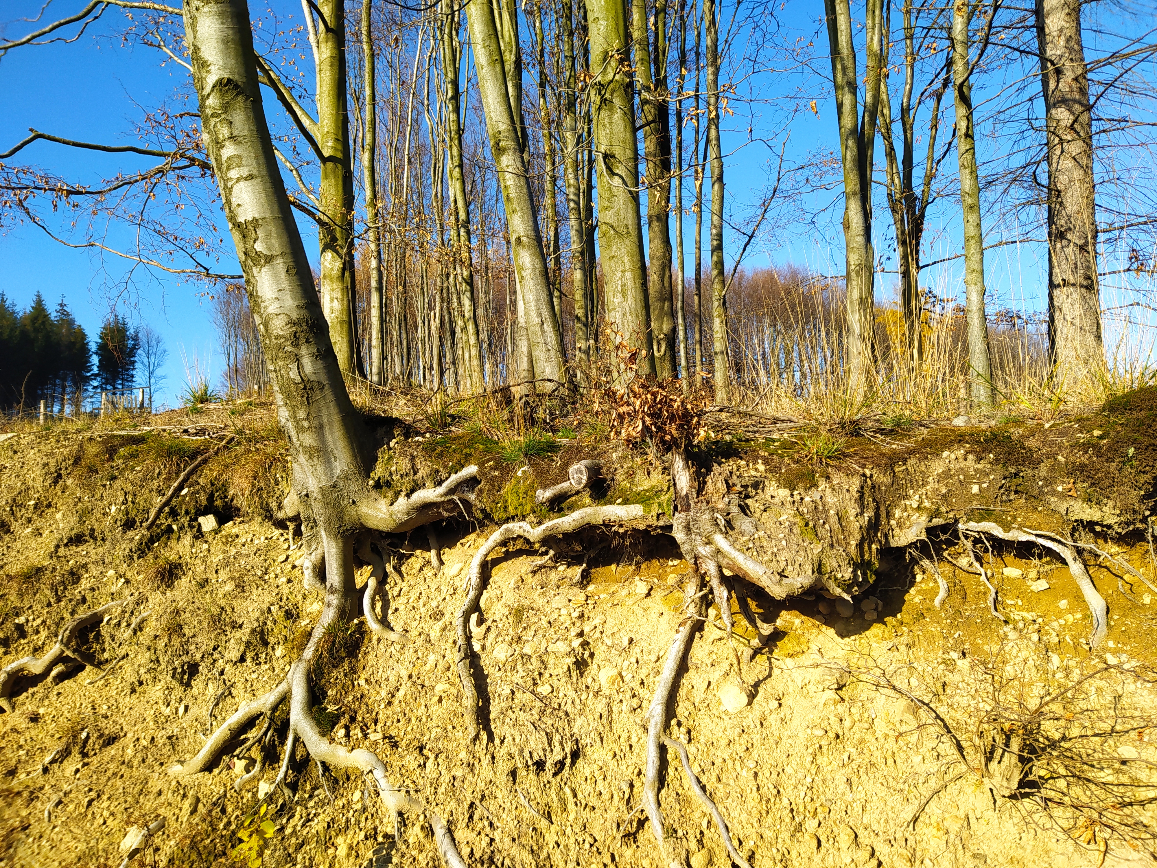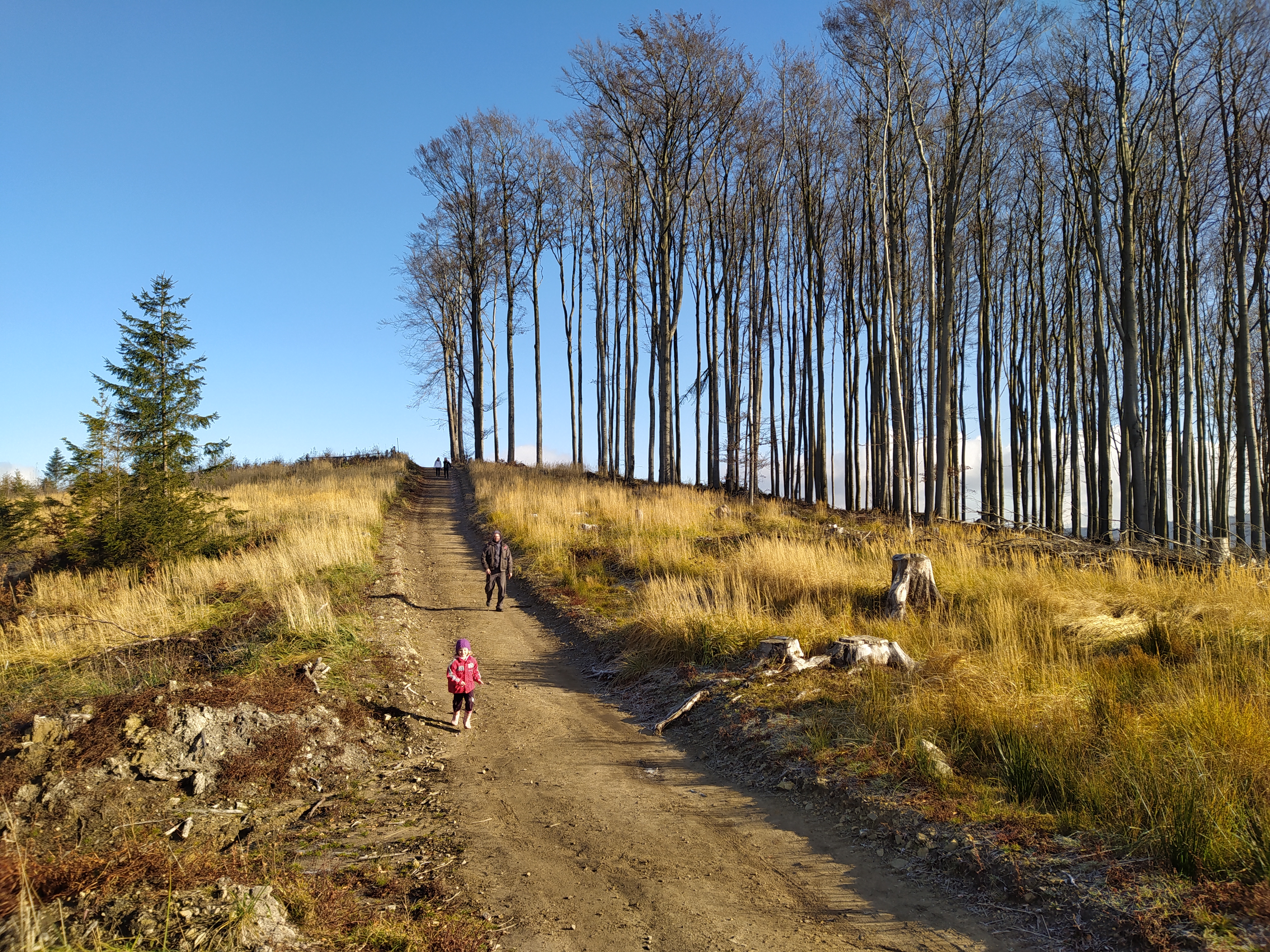 Na nejvyšší vrchol Hostýnků – Kelčský Javorník – vede několik turistických a cyklistických tras. Ani jedna nepatří k nejjednodušším pro rodiny s dětmi. My se vydali z obce Rajnochovice, která je pro nás známá Osmáckým pohádkovým lesem, který si tu každoročně užíváme. Zaparkovali jsme u točny hned na okraji obce a vydali se nejprve po obecní asfaltce po rovince. Po odbočce doleva už to byl jeden „krpál“ za druhým! 🙂 Bez nadsázky – některé kopce vedoucí k cíli jsou velmi prudké. Následovala úzká cesta lesem a pak už jsme se napojili na širokou, zpevněnou, kamenino-hliněnou cestu. Počasí nám přálo. Tentokrát žádný bahenní zábal nohou (jako tomu bylo cestou na Vartovnu – klik). Nebe krásně modré, zkrátka krajina jak z pohádky.