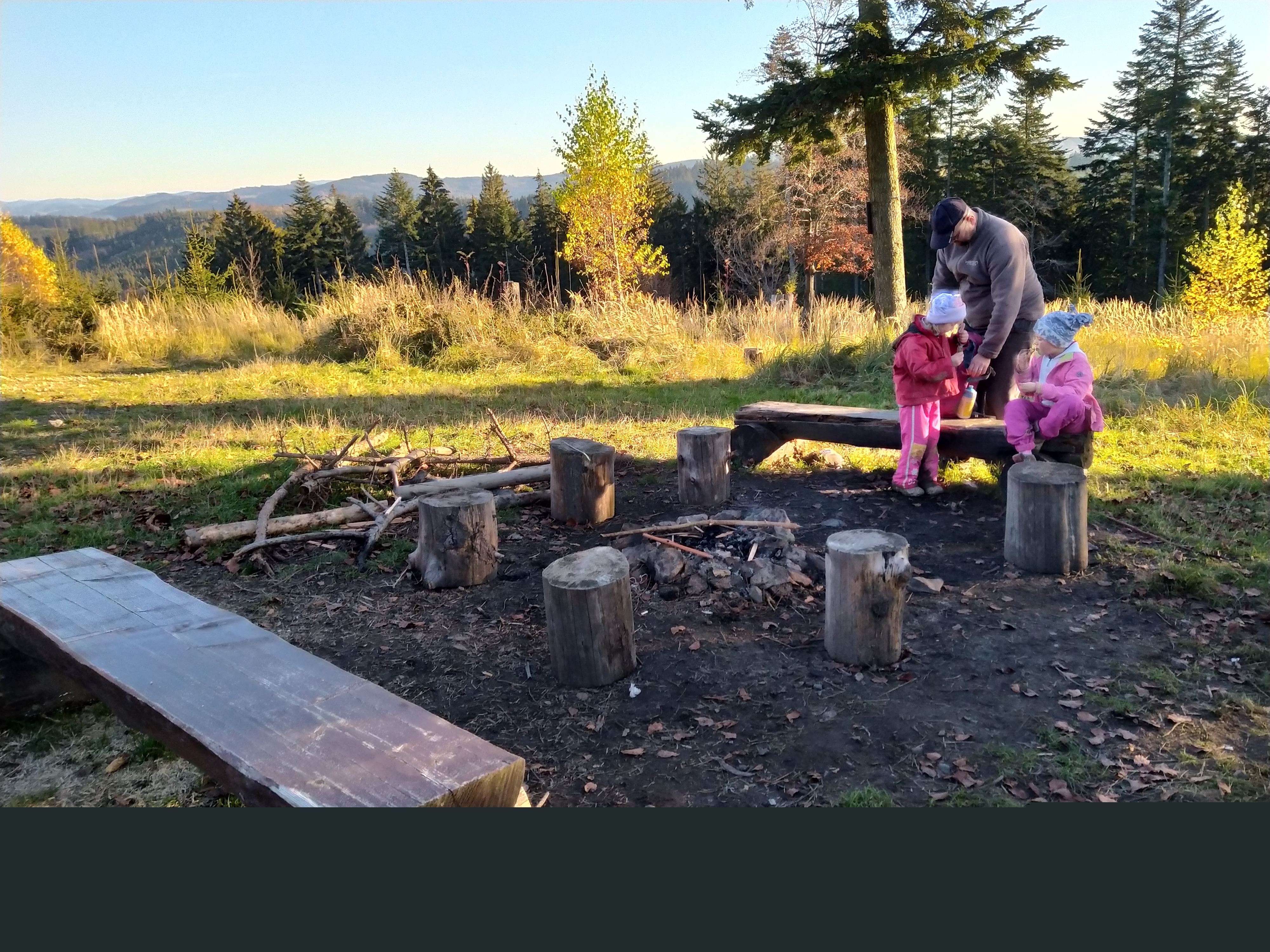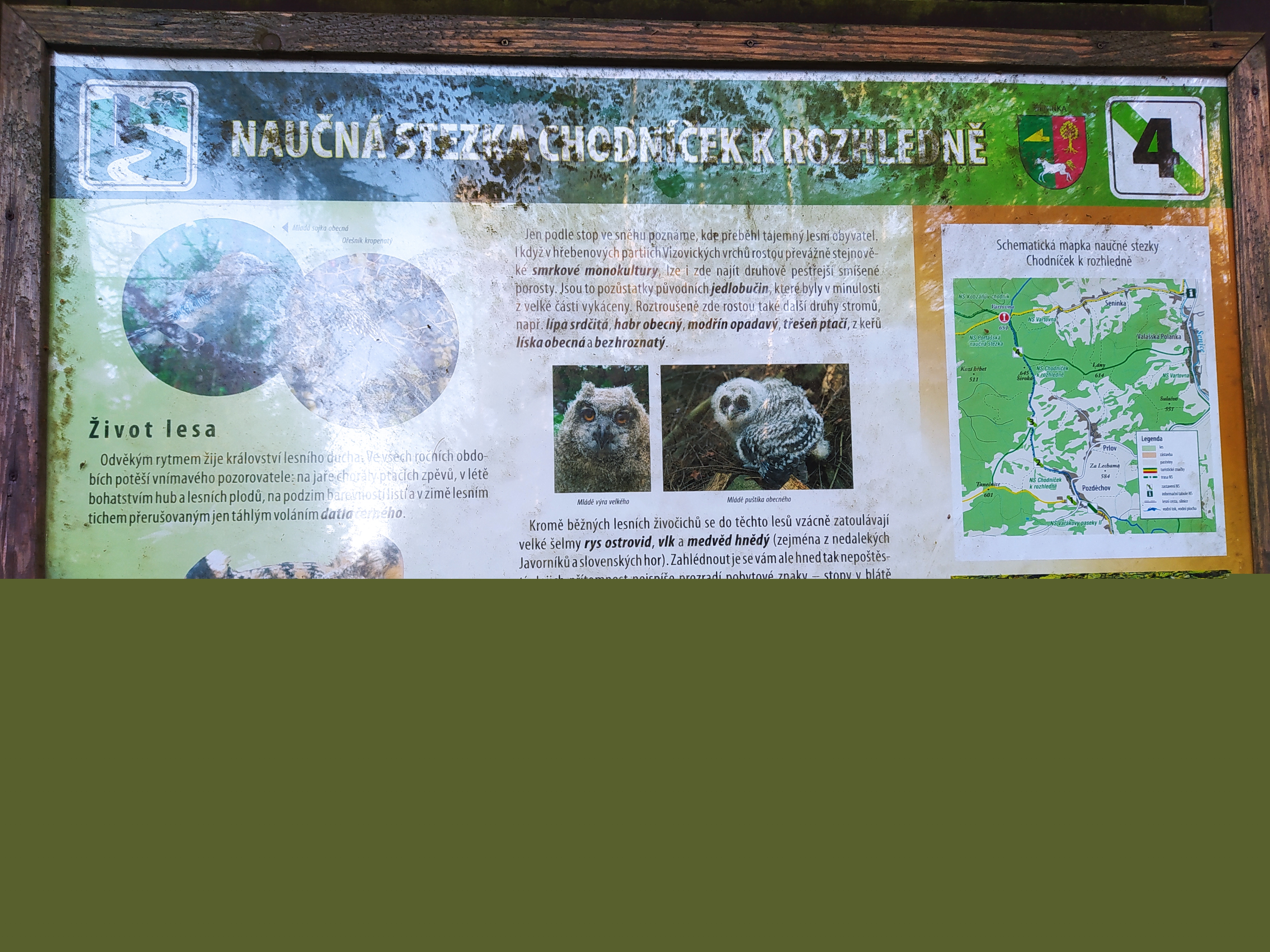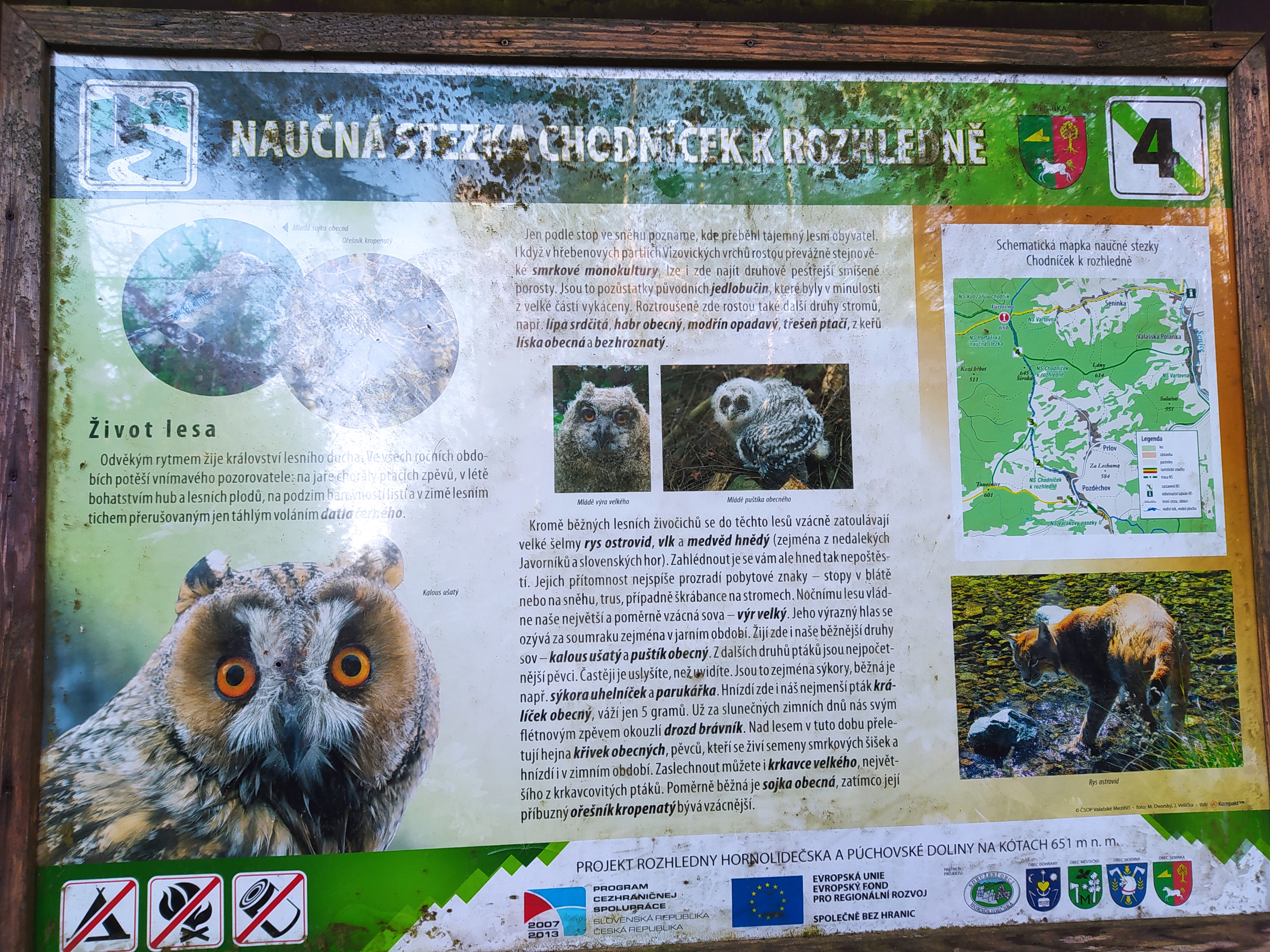 No a to nejlepší na nás teprve čekalo. Bahnitá cesta do kopce po žlutočervené a následně i žlutomodré turistické značce a naučné stezce K rozhledně vede Naučná stezka Chodníček k rozhledně. Počasí nám vyšlo krásné, ale v místech kde nesvítilo sluníčko bylo v lese neskutečné bahno. Naše Bětuška ho měla až po kolena a několikrát po cestě i upadla takže ve finále byla od bahna celá.