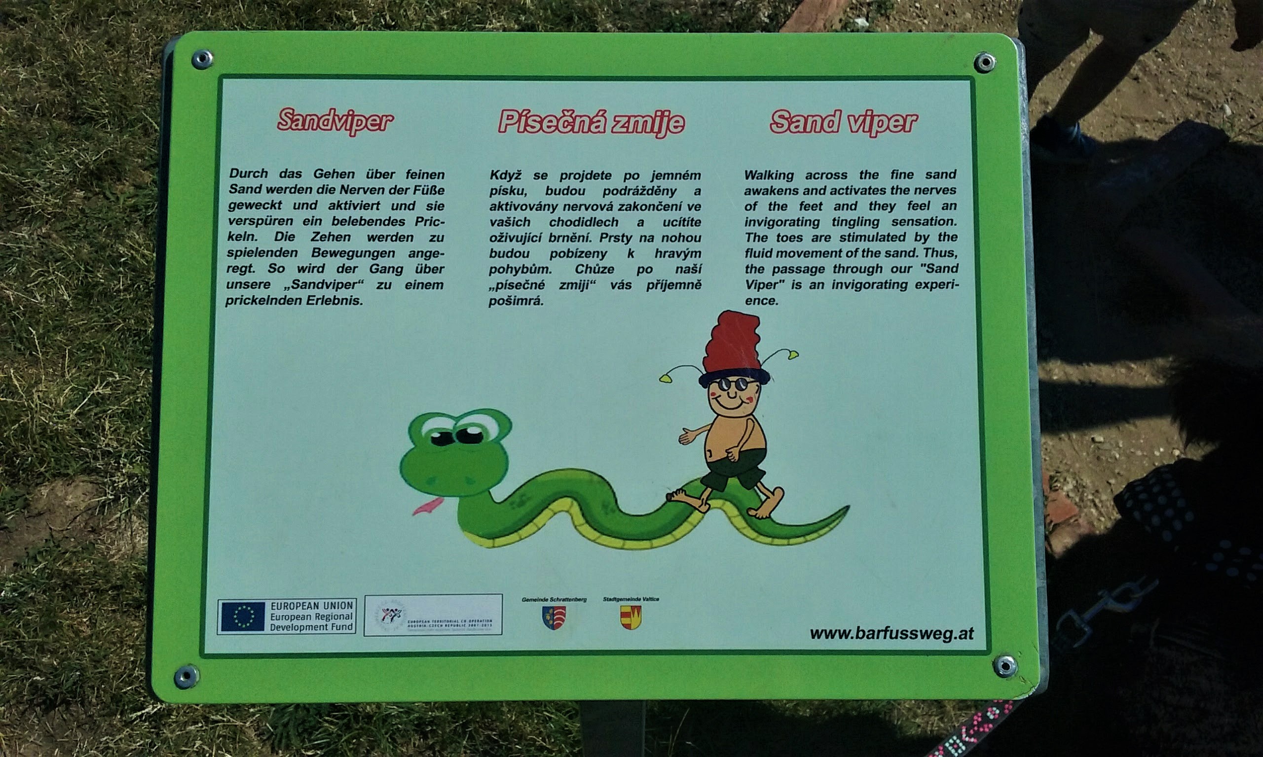 Okružní trasa o délce necelých 5 km vede ze sousední rakouské obce Schrattenberg k Valticím – k romantické stavbě Kolonáda na nejvyšším bodě Lednicko – valtického areálu. Po cestě je umístěno celkem 11 zastávek, na kterých se návštěvníci můžou projít bosi po kůře, šiškách, písku, kamenech… Balancovat na vratkém mostě z dřevěných trámů, odpočinout si na dřevěných lehátkách a kochat se pohledem do širokého okolí z nejvyššího místa – kopce Homole. Děti se mohou sklouznout na přírodní skluzavce. Chůzí bosou nohou po různých přírodních materiálech mají být zprostředkovány zvláštní smyslové vjemy. Kdo bude chtít, může si na zastávce s přírodním grilem připravit něco z přinesených zásob.